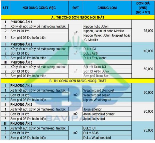 Dưới đây là bảng báo giá sơn nhà trọn gói và nhân công