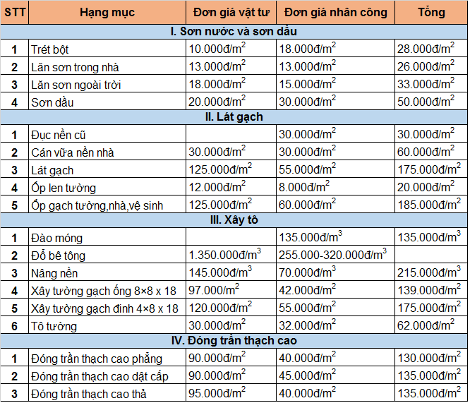 Bảng báo giá sơn nhà, báo giá sửa nhà, báo giá lát gạch sửa nhà, xây tô đào móng, đóng trần vách ngăn thạch cao.